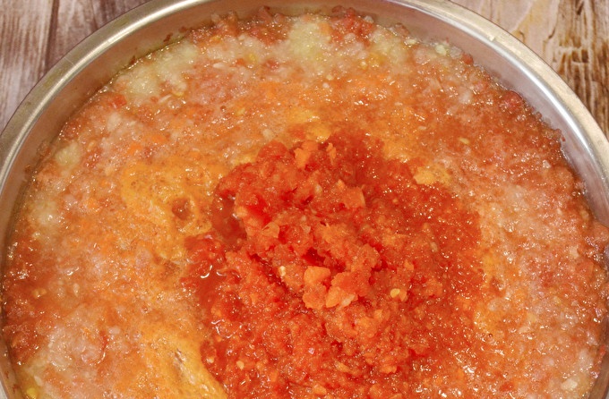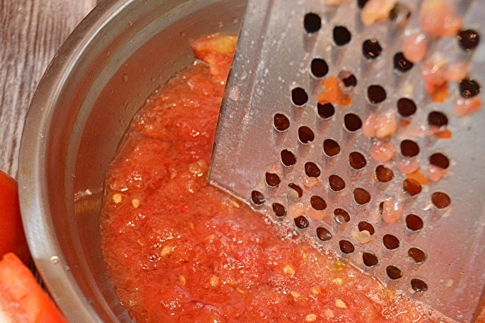 تحضير المنتجات المناسبة. جميع مكونات adjika يجب أن تكون الأرض. يمكن مفروم الطماطم ، يمكنك فقط صر. إذا لم تكن الطماطم كبيرة جدًا ، فيمكنك عمل مبشرة.