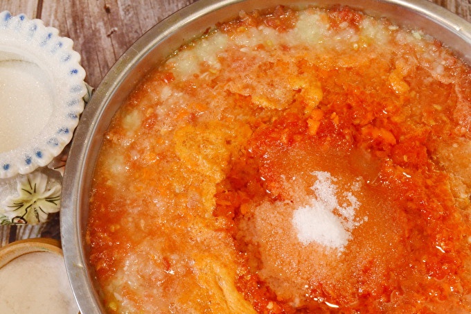 إضافة زيت عباد الشمس والسكر والملح إلى adjika. استمر في الطبخ لمدة نصف ساعة أخرى. في عملية adjika ، سنحاول إضافة الملح والسكر حسب الرغبة.