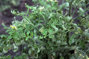 الشكل الحاد للأمراض هو تشديد الوريد المركزي على سطح الورقة. المرحلة التالية هي تشوههم ولفهم. بصريا ، يبدو أن الورقة امتدت. عمليا دائما ينتشر شجيرة الجزء العلوي من الطماطم بشكل عمودي.