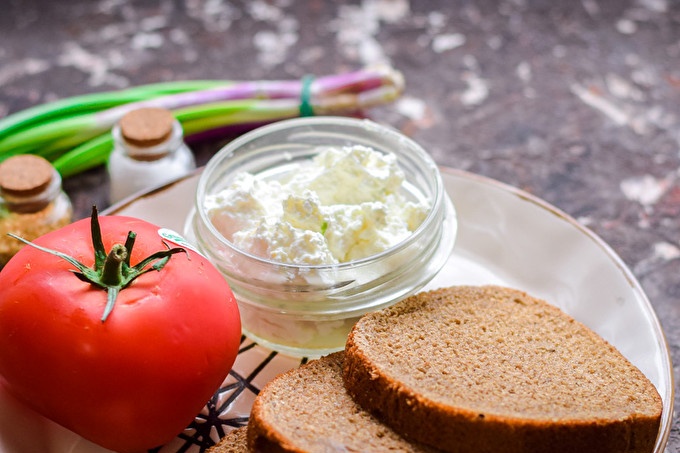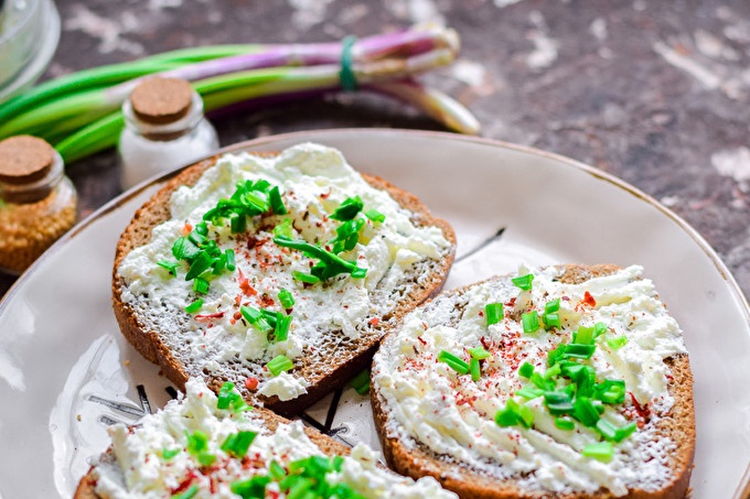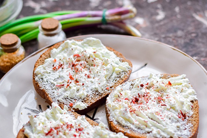 جبن خثارة لاستخدامه في المنزل أو المتجر ، يمكن تناول هذا الأخير مع إضافة التوابل والبهارات. جبنة كوخ مسحة أعدت شرائح من الخبز.