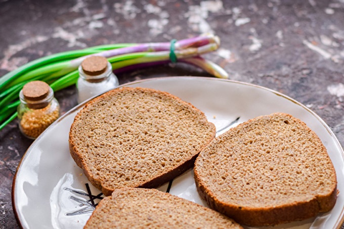 تحضير جميع المنتجات في القائمة. اختر خبزًا داكنًا لذيذًا ، مقطّعًا إلى قطع متساوية الحجم وانشرها على طبق.