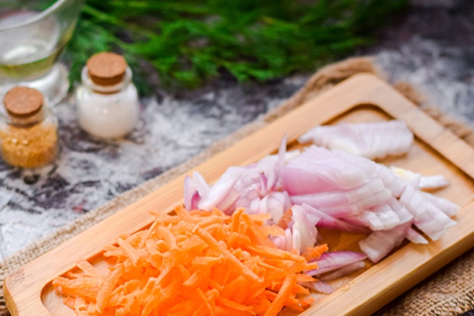 تحضير جميع المكونات اللازمة في القائمة. اختيار الجزر متوسطة الحجم والبصل ، وتنظيف الخضروات ويغسل ، جافة. بعد تقطيع البصل في مكعبات صغيرة ، صر الجزر على مبشرة متوسطة.