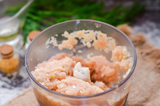 اطبخ اللحم المفروم في وعاء الخلاط أو في مفرمة اللحم. خذ لحم الخنزير والديك الرومي كأساس للحوم اللحم ، إذا رغبت في ذلك ، يمكنك إضافة أي نوع من اللحوم. طحن اللحوم حتى تصبح ناعمة.