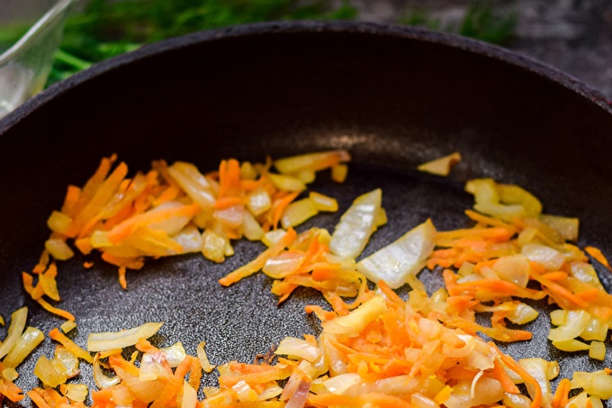 تسخين ملعقة من الزيت النباتي في مقلاة ، والجزر التحول والبصل والخضروات يقلى لبضع دقائق.