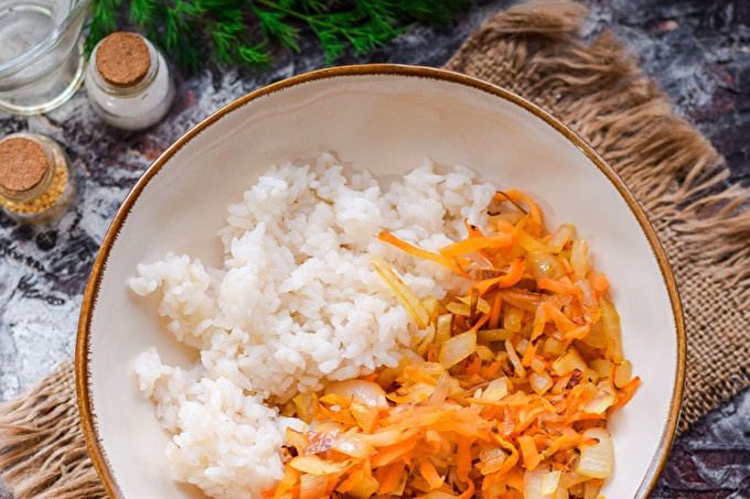 غلي الأرز مقدمًا - ضعي الأرز في وعاء ، أضيفي الجزر والبصل المقلي.
