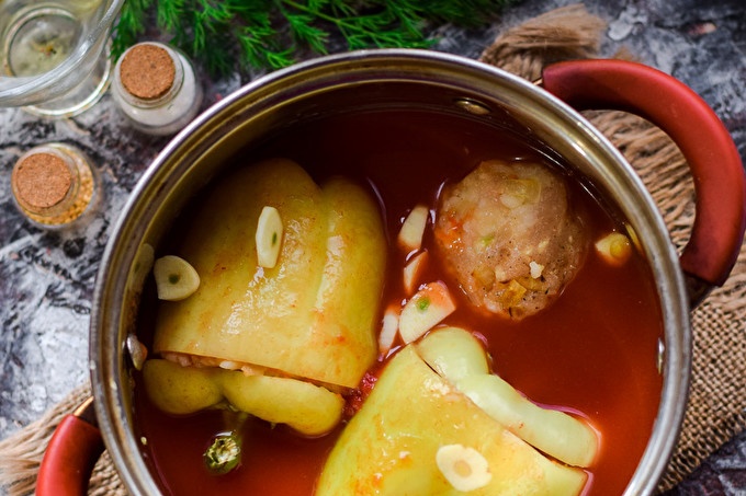 ضعي الفلفل في قدر ، اسكبي صلصة الطماطم ، أضيفي الثوم ، مقطّعين إلى أطباق ، ملح وفلفل ، أضيفي قليلًا من السكر. يُطهى الفلفل لمدة 40 دقيقة ، بعد الوقت المحدد ، يُقدّم الفلفل إلى المائدة.