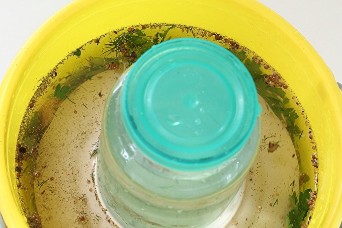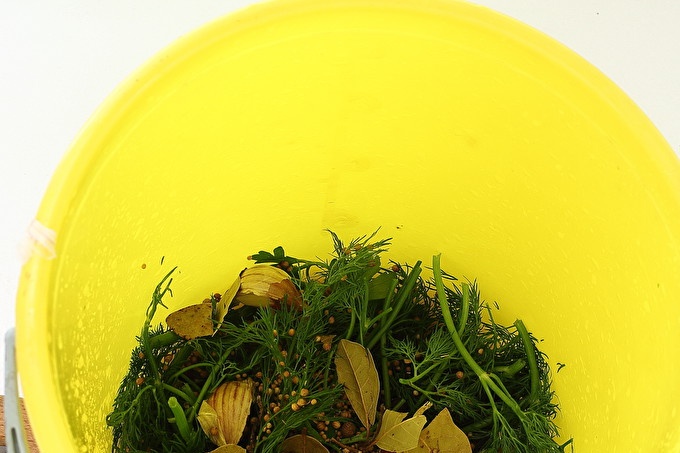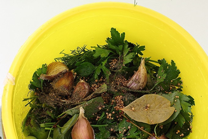 قم بإعداد حاوية حسب كمية المنتجات الأولية. في الجزء السفلي ، وزّع نصف معايير البقدونس المغسول والشبت وأوراق الكرز وبذور الكزبرة والخردل وأوراق الغار وغسل فصوص الثوم غير المقشورة. يمكنك استخدام مظلات الشبت والجذر وأوراق الفجل.
