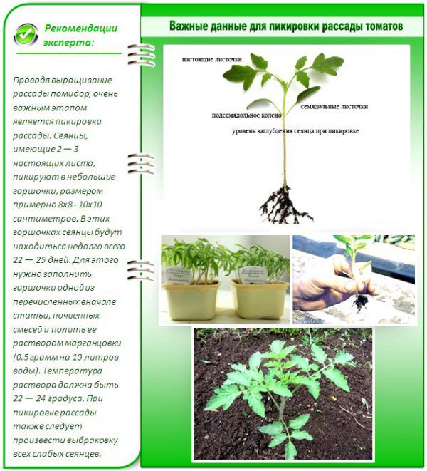 التقط شتلات الطماطم المنتجة عندما يكون لديها 2-3 أوراق حقيقية. يحدث هذا بعد حوالي أسبوعين من إنبات البذور. تقصر الشتلات الجذر قليلاً وتزرع كل براعم في وعاء منفصل ، ويفضل في أوعية الخث.النباتات مباشرة فيها تهبط بعد ذلك في مكان دائم في الأرض. وفقًا للتقويم القمري ، فإن أكثر الخيارات ملاءمةً هي: