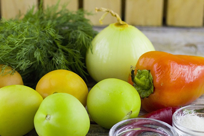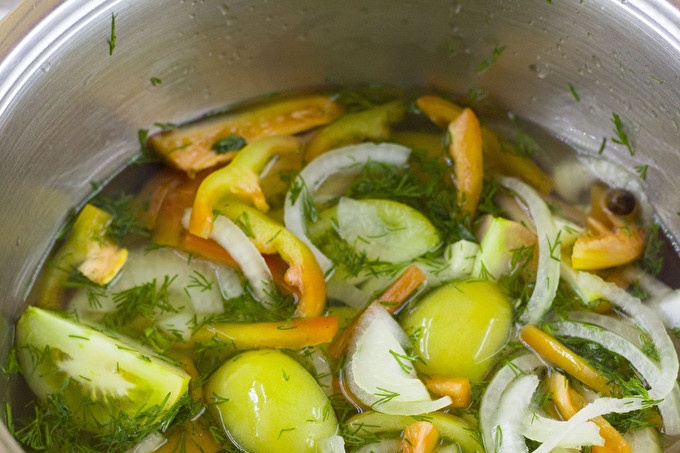 يذوب الملح والسكر في كوب من الماء ويصب في قدر. فصوص ثوم كاملة مقشرة ، فلفل ، خضار ، تغسل بعناية وتضاف إلى الخضار يُسكب الماء المتبقي في قدر ، ويُغطى بغطاء ويُهز جيدًا. يجب أن يغطي السائل طبقة من الخضروات. غطي الطماطم بالشاش وضعيها تحت نير لمدة أسبوعين في مكان دافئ.