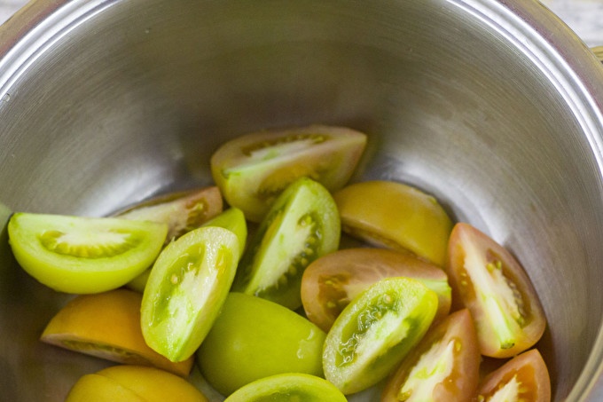 قطع الطماطم مع الصليب ، ولكن ليس تماما أو في أرباع متساوية. بطريقة مماثلة لخفض جميع الطماطم ، والتي سوف تضمن التمليح موحدة. قم بطي كل الفاكهة في قاع قدر بسعة 5 لتر.