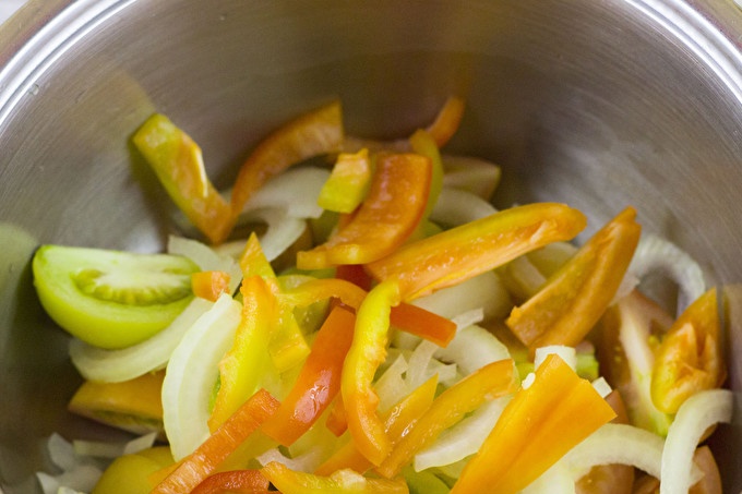 الفلفل البلغاري تنظيفها من البذور والأغشية وقش القش. إرسالها إلى بقية الخضروات في المقلاة.