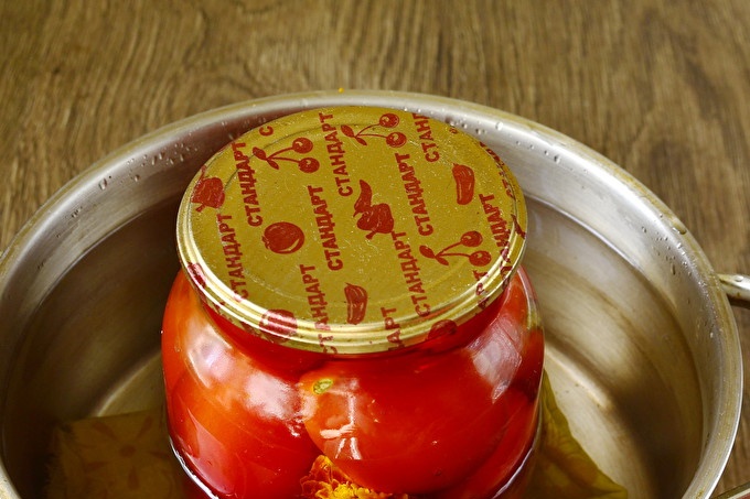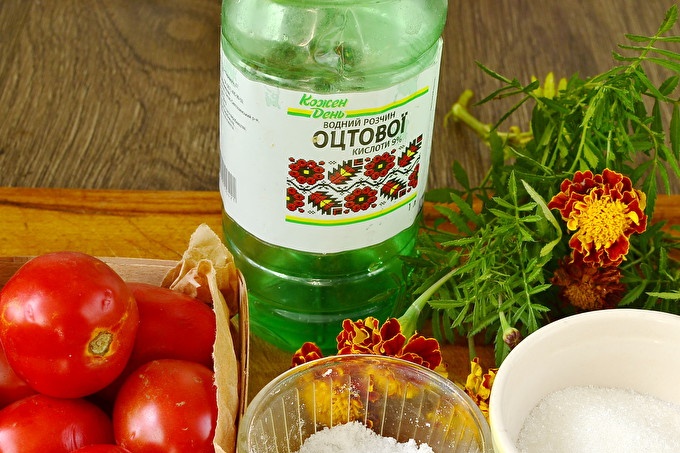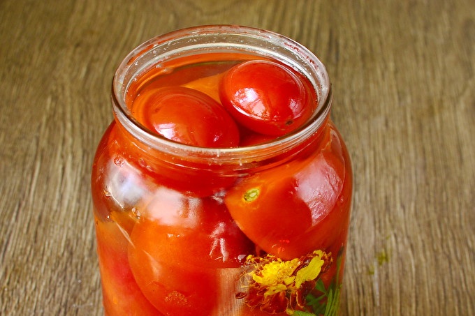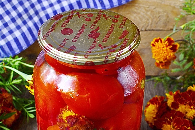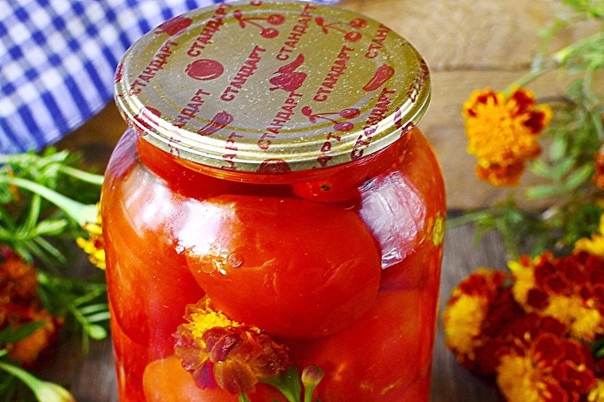 نقدم انتباهكم إلى الوصفة التالية للطماطم المخللة اللذيذة لفصل الشتاء. هذه المرة وضعنا في جرة 1 لتر مع زهرة القطيفة. هذه الزهرة الرائعة لديها رائحة لطيفة وقوية لدرجة أننا لسنا بحاجة إلى المزيد من التوابل. هذه الطماطم (البندورة) تخرج بشكل غير عادي ، وذوقها الأصلي.