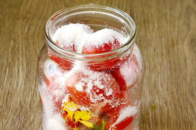 نغسل الجرة جيدًا وننظف التلوث باستخدام صودا الخبز. ليس من الضروري التعقيم ، لأننا سنبستر الخضروات بأنفسهم في العلب. تغلي الغطاء خمس دقائق لتطهير. يتم وضع الطماطم المحددة ككل في جرة.