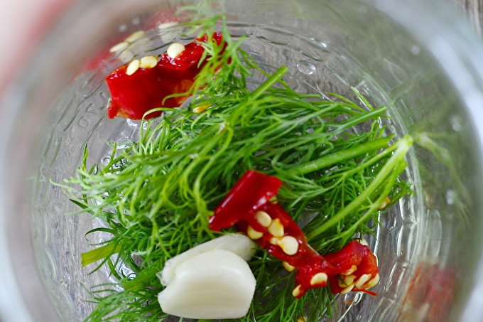 الطماطم قابلة للغسل. من الأفضل أن تأخذ الثمرة ليست كبيرة جدًا ، لذلك مع بذل القليل من الجهد لوضع الحاوية ثم إزالتها من هناك. تعقيم الجرار في طريقتك المفضلة. يمكن القيام بذلك بالبخار ، في الفرن ، وحتى في الميكروويف. أغطية ضيقة تتبخر في الماء المغلي. الآن ، في كل من العلب النظيفة والجافة ، ضع الثوم المقشر (ككل) وفروع الشبت وحلقات صغيرة من الفلفل الحار. إذا لم تكن حريصًا للغاية ، فيمكنك تخطي هذه الخطوة.