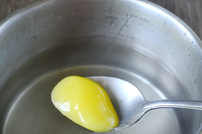 يُصفّى الماء البارد في وعاء مناسب ، ويضاف إليه ملح المطبخ ، وجزء من الخل وستة ملاعق كبيرة من العسل.