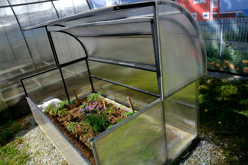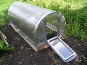 هذا الدفيئة يكرر بالضبط تصميم سلة الخبز الحقيقية. مصراع نصف دائري يرفع بالكامل. في الوقت نفسه يتحرك وراء الجزء الثابت من السقف نصف دائري. أنها مريحة لرعاية النباتات ، والبناء لا يأخذ الكثير من المكان.