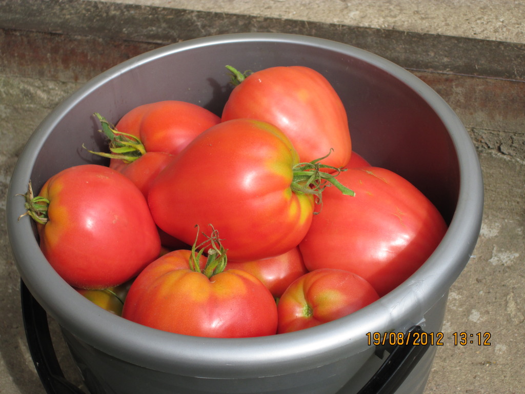 - بالطبع ، واحدة من المزايا الرئيسية لهذه الطماطم هي ثمارها الكبيرة. يمكن أن تصل كتلة الطماطم على الفرش الأولى إلى 800 جرام أو أكثر. على جميع 500-600 غرام أخرى.