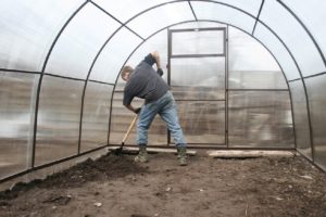 من الطبقة العليا من التربة تحتاج إلى اختيار جذور النباتات. للقيام بذلك ، يجب حفر التربة على عمق 5-7 سم باستخدام الشوك. لا ينبغي إحضار الأمر داخل وخارج الدفيئة فحسب ، بل أيضًا تنظيف المساحة المحيطة بالبنية من الحشائش وبقايا المحاصيل السنوية.