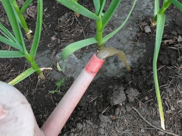 تُصنع الضمادات العلوية للثوم الشتوي في الربيع بعد ذوبان الثلج - اليوريا أو نترات الأمونيوم أو المواد العضوية (فضلات الطيور أو مولين - 1 كجم لكل 8-10 لتر من الماء). خلال موسم النمو ، يمكن تغذية النباتات بمحلول الرماد.