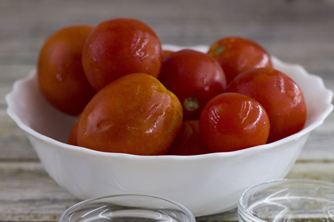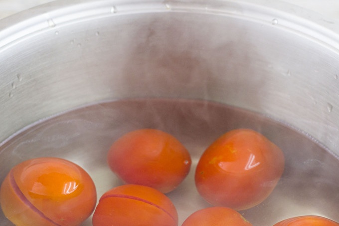 للبدء ، سوف نأخذ 2 كيلوغرام من الطماطم ، ونغسلها ، ونعمل على تقطيعها على شكل قطع وسحقها بالماء المغلي ، ونترك الحاويات مع الماء المغلي لمدة 20 دقيقة. بعد ذلك ، قم بإزالة السكين بحذر من بقايا الجلد. للحصاد ، استخدم ثمارًا غير ناضجة قليلاً مع عدم وجود آثار للنباتات والعفن.