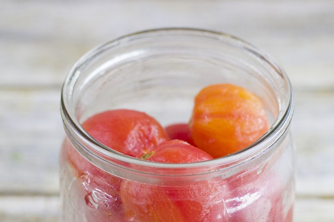 تحتاج أولاً إلى تعقيم الجرار ، ووضع ثلثي الطماطم بدون الجلد في وعاء. نوصي التراص الخضروات فضفاضة. لجعل الطماطم لذيذة ورائحة ، ضع الأعشاب الطازجة / الجافة ، حلقات البصل والجزر في القاع. من أجل الحدة والتوابل ، أضف قطعة من الفلفل الحار والفلفل الأسود (البازلاء) والكزبرة وورقة الغار.