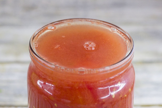 سوف تغسل الخضروات المتبقية ، نلتف من خلال مفرمة اللحم أو العصارة. يُسكب عصير الطماطم الجاهز في قدر ويُغلى المزيج ويُضاف إليه السكر والملح. يُمزج ويُطهى المزيج لمدة 15-20 دقيقة ، مع إزالة الرغوة بشكل دوري. لعصير العصير الطماطم الناعمة المناسبة مع الجلد المتصدع