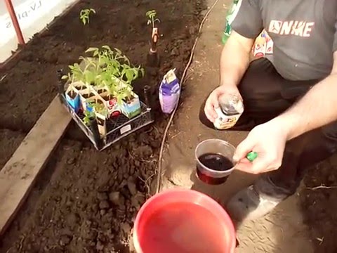 كيفية تسميد الطماطم بعد الزراعة في الأرض - هذا هو السؤال المهم الثاني. بعد نقل الشتلات إلى الدفيئة ، فإنها لا تطعمها خلال الأسبوعين الأولين. بعد ذلك ، اصنع سمادًا: في دلو من الماء ، اخلطي ملعقة واحدة من نيتروفوسكا غرفة الطعام ونصف لتر آذان الدب. بعد ذلك ، صب لتر تحت كل الأدغال.