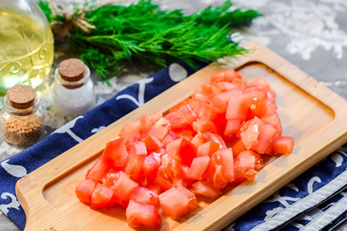 تحضير جميع المنتجات في القائمة. غسل وتجفيف الطماطم ، وإزالة مكان نمو الساق. قطع الطماطم إلى مكعبات صغيرة.