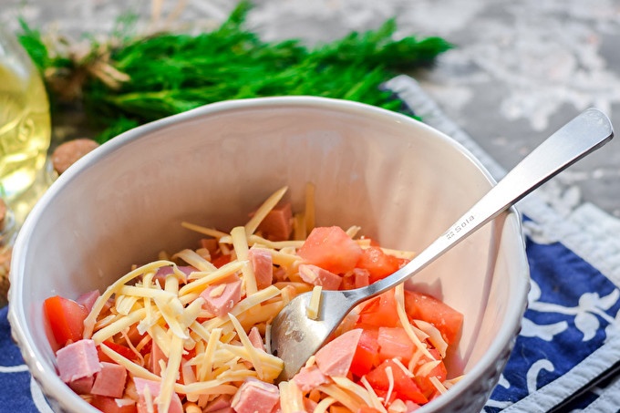 النقانق المسلوقة اختر الدرجة العالية اللذيذة. قطع السجق إلى مكعبات متوسطة الحجم. كما يختار الجبن الصلب شركة تصنيع لذيذة وعالية الجودة. صر الجبنة على مبشرة متوسطة.
