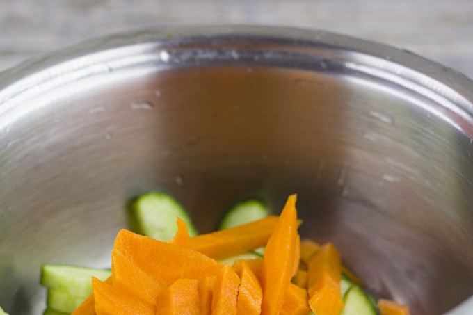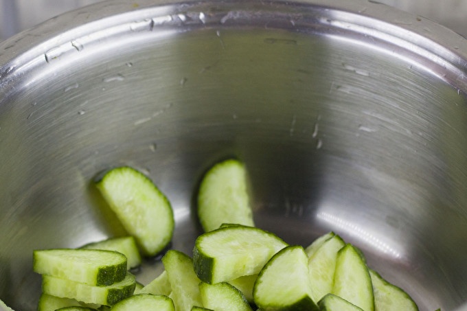 بادئ ذي بدء ، اترك الخيار ينقع لمدة ساعتين في الماء البارد حتى يصبح خاليًا من الأوساخ والنترات. إزالة الحمار ، تجفيف الرطوبة ، مقطعة إلى نصف الدوائر ووضع في قدر. إذا كان جلد الخيار سميكًا وصلبًا ، فيجب قطعه بسكين. لإعداد سلطة "أصابع يم" استخدام الفواكه الكاملة دون طعجات وتعفن.
