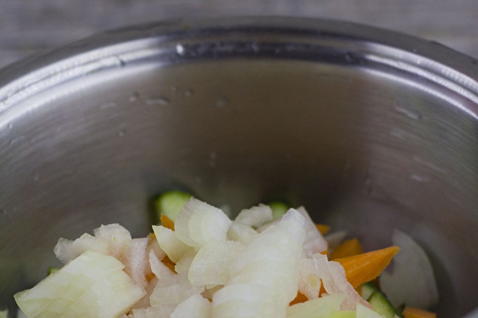 تم سحق البصل المقشر إلى مكعبات صغيرة ، تضاف إلى المكونات. بالإضافة إلى ذلك ، تم تقطيع الثوم إلى قطع صغيرة وإضافته إلى مقبلات الخضار.