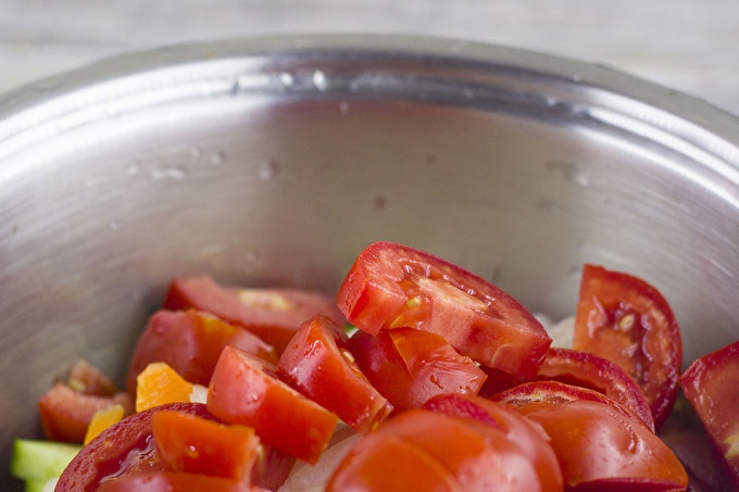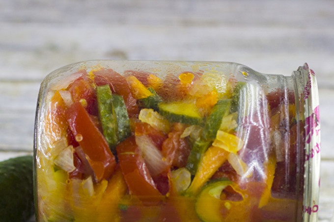 تغسل الطماطم وتُجفف وتُقطع إلى شرائح صغيرة وتُوضع في سلطة ، وتُضاف الزيت النباتي وملح المائدة الكبير والسكر والتوابل (البهارات البهارات). وضعوا على أقصى قدر من النار ، ويقلب ، ويغلي ، ثم تقليل النار ويطهى لمدة 15 دقيقة. حوالي 5 دقائق قبل أن تصبح جاهزة ، صب الخل وتخلط المكونات.