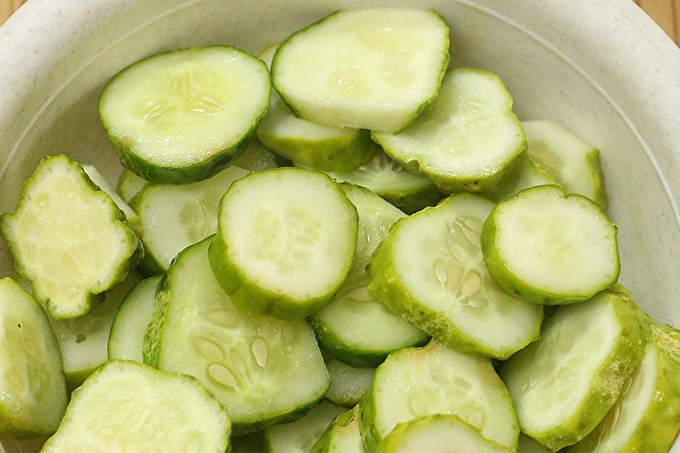 يقف الخيار في ماء بارد لمدة ساعة لإرجاع الهشاشة. ثم تشطف وتقطع إلى شرائح بسمك 1-1.5 سم.