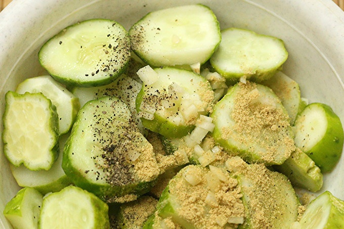 شرائح الثوم مقطعة إلى مكعبات صغيرة أو فرك مبشرة. جنبا إلى جنب مع مسحوق الخردل والفلفل المطحون تصب في الخيار. إثارة.