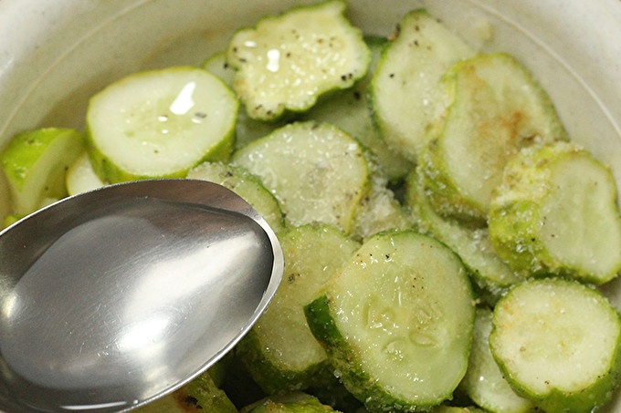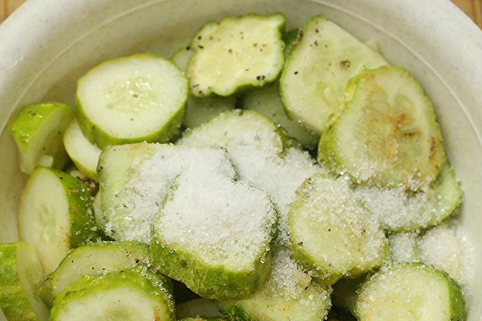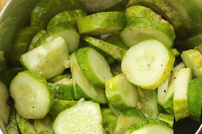 يُسكب الخيار مع شرائح الزيت ويُرش بالخل. غطي المزيج واتركه لبضع ساعات للإصرار وإعطاء العصير. حرك بشكل دوري لتشكيل المزيد من المياه المالحة.
