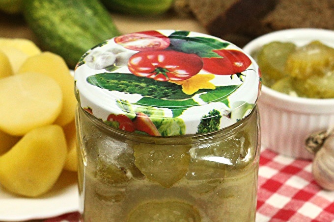 غطي العلب الساخنة بخيار شرائح منقوش ، وقاوم ساعات 8-10 أو حتى تبرد تمامًا. بعد الاحتباس الحراري ، نزيل للتخزين في مخزن. ناجحة لك الاستعدادات!