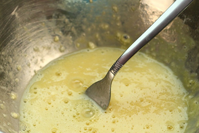 فاز مع بيق أو يد خفقت حتى كتلة متجانسة ، لزج معتدل. يجب أن لا يكون الخليط سميكًا جدًا.
