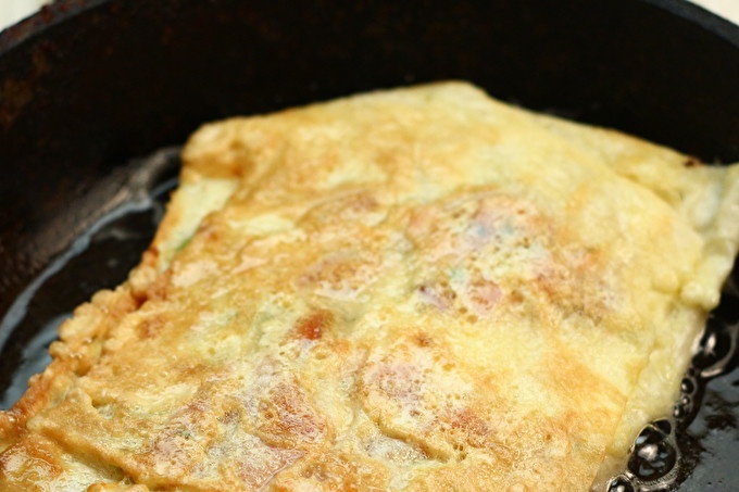 سخني الزيت النباتي في المقلاة ، اغمس خبز البيتا مع ملء الخليط والقلي. يقلى على نار معتدلة حتى يصبح لونه بنياً ذهبياً على كلا الجانبين.