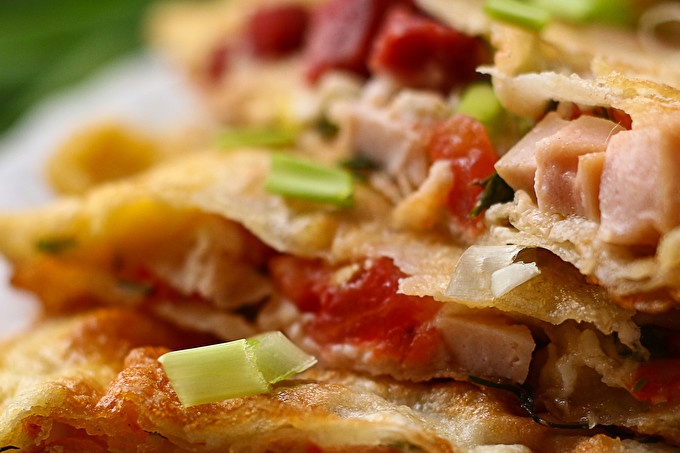 كل ورقة من بيتا مقطعة إلى مستطيلات أو مربعات متطابقة. الحجم - حسب تقديرك ، طالما يتم وضع الفراغات على المقلاة. من السهل قطع خبز البيتا مع مقص المطبخ أو سكين حاد للغاية (وإلا فإن قطعة رقيقة من العجين سوف تمزق).