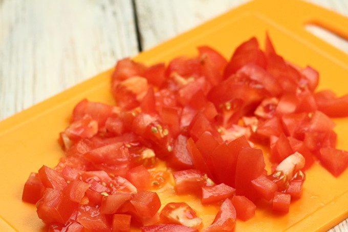 يتم قطع الطماطم أيضا إلى مكعبات.