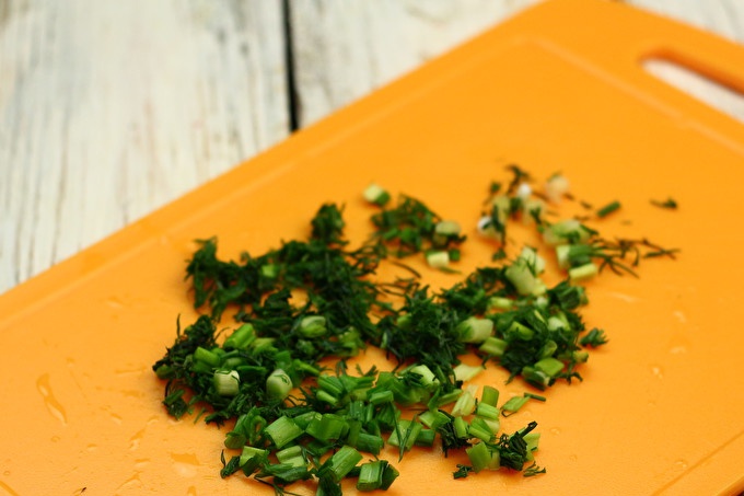 طحن الخضر قبل غسلها. يمكنك أن تأخذ نوعًا واحدًا (الشبت والبقدونس والبصل الأخضر) أو قليلاً من كل شيء.