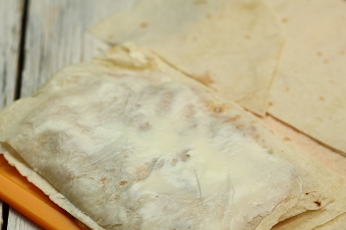 غطيها مع الفراغ الثاني (الجانب المشحم لأعلى). جعل 1-2-3 طبقات أخرى من الوجبات الخفيفة. لتشكيل جميع "المغلفات" وفقا لهذا المخطط