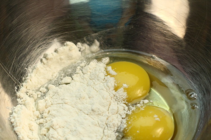 طبخ الخليط: ضع البيض في وعاء عميق ، وأضيفي الدقيق وبعض الملح.