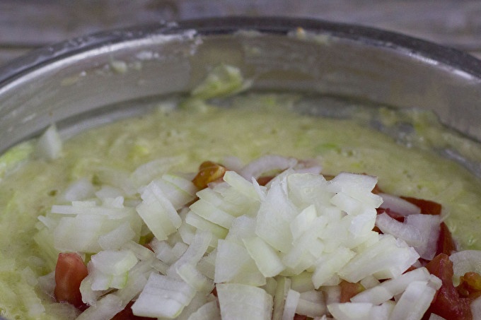 ثم نغسل الطماطم ونقطعها إلى مكعبات ونضيفها إلى كتلة القرع. إذا رغبت في ذلك ، يمكنك تحرق الطماطم ووضعها في ماء بارد وإزالة الجلد. بدلاً من الطماطم ، يمكنك إضافة صلصة الطماطم أو الكاتشب.